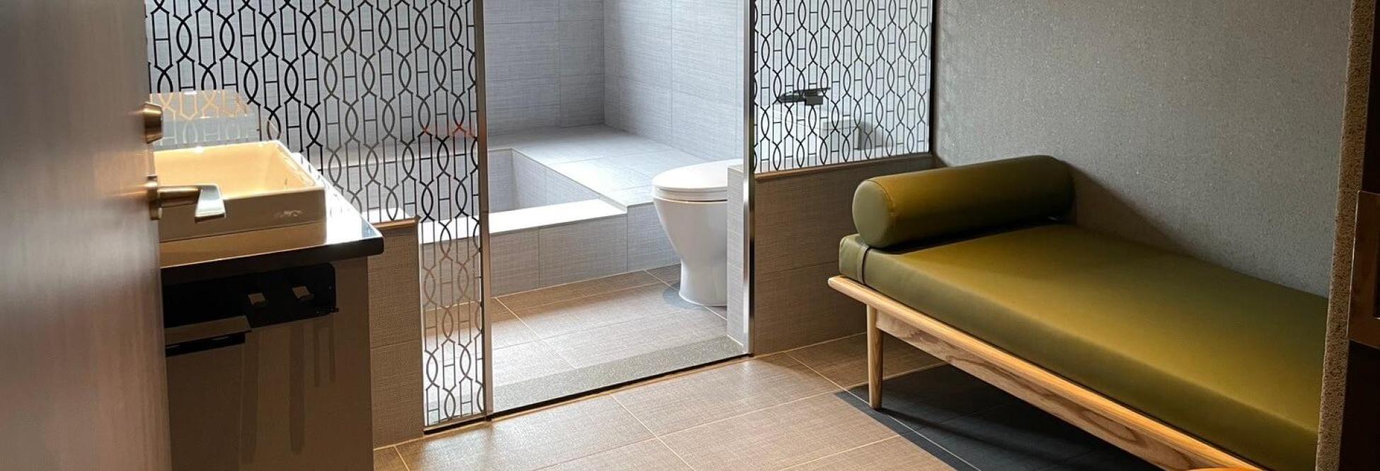 雙人沙發椅安放身影,獨立衛浴與泡湯池靜候片刻沉澱。